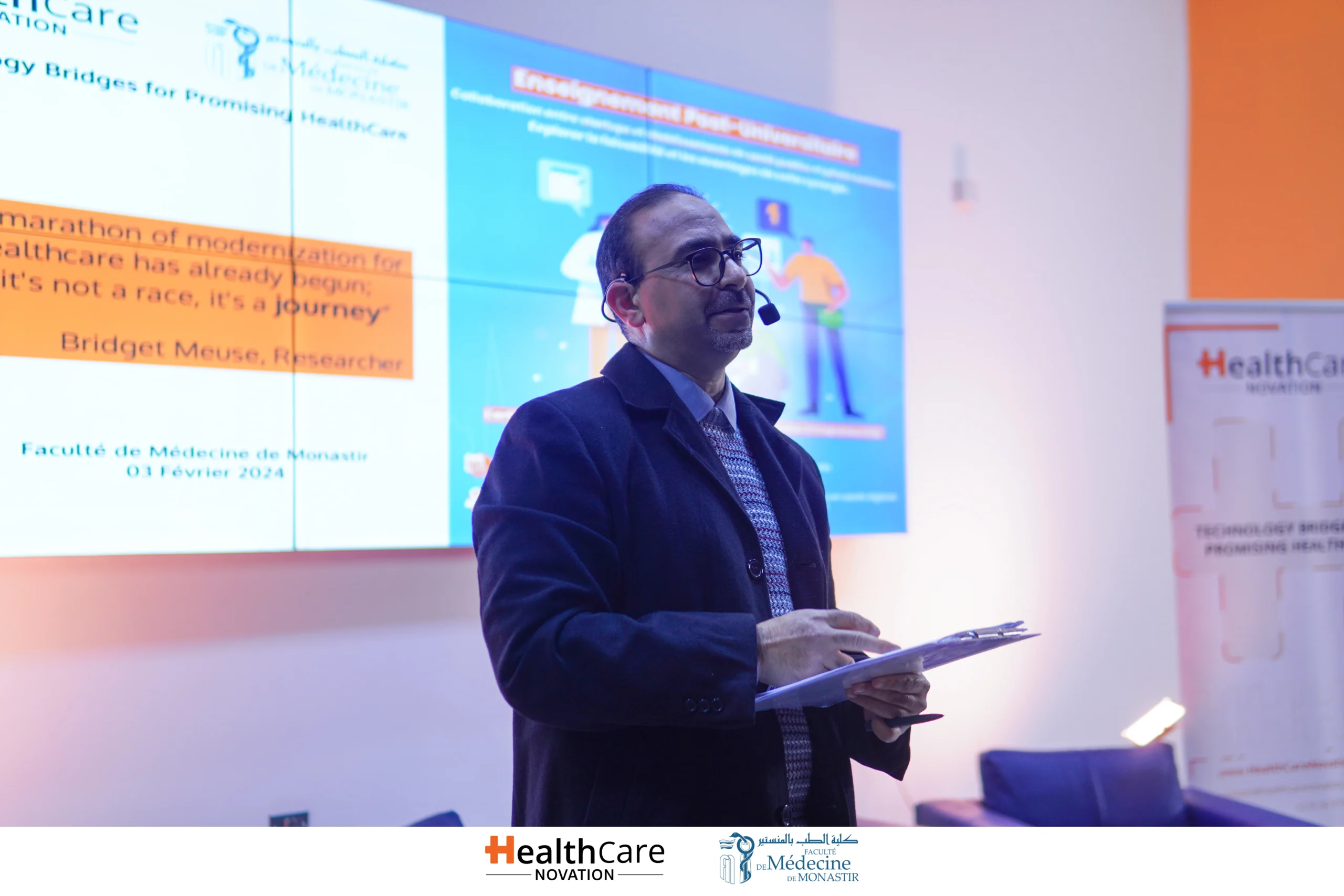The first postgraduate session (3 February 2024) gathered 120+ participants from university hospitals in Monastir, Sousse, Mahdia, and Nabeul, alongside entrepreneurs and administrators. Speakers included: Prof. Charfeddine Amri (Dean, FMM & Smart Lab Director), Dr. Zouhour Ouanes (Assistant Professor, ISBM), Dr. Mohamed Majdi Karray (Founder, MedicaCom), and Mr. Slaheddine Dardouri (Moderator).